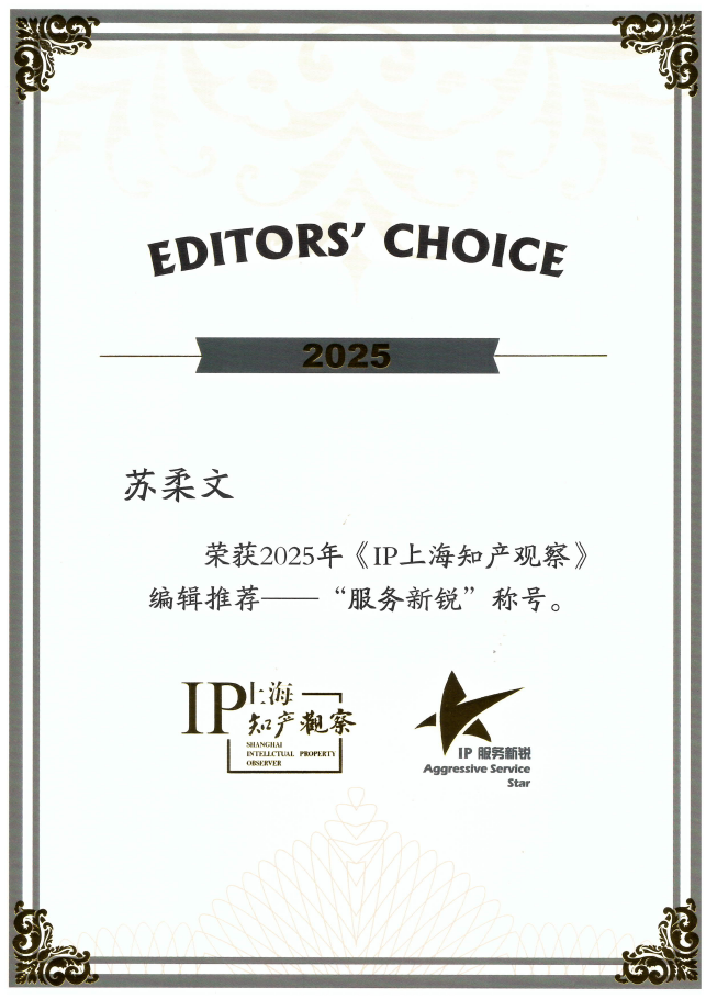 集佳上海分所苏柔文律师凭借优秀的专业素养与突出的业务表现获评“2025知识产权服务新锐”。