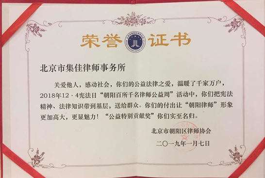 2019年1月8日,北京市朝阳区律师协会为集佳律所颁发荣誉证书,对集佳积极参加“朝阳百所千名律师周”活动的公益之行点赞,称集佳获得“公益特别贡献奖”实至名归。 为深入宣传国家宪法日,大力弘扬法治精神,北京市朝阳区律师协会在2018年12.4全国第五个宪法日到来之际,倡议发起了“朝阳百所千名律师公益周”活动,号召以律所为平台,以法制讲座、现场咨询、发放宣传资料等形式深入社区、校园,就老百姓的关心的热点难点,提供精准服务。集佳律所积极响应号召,于12月4日“国家宪法日”当天,由顾润丰律师带领数名员工下基层,参加建外街道辖区宣传活动,就宪法及其他与公民切身相关的法律法规进行了宣传,为市民一对一提供免费法律咨询,并积极向参加活动的群众发放了由朝阳律协统一提供的法律服务手册、普法宣传册等法制宣传材料,受到了群众的欢迎。通过这次活动,朝阳区律协把宪法精神、法律知识带到基层,送给群众,公益法律之爱温暖了千家万户,让“朝阳律师”品牌形象更加高大,更显魅力。 集佳通过参加此次活动,进一步体会到深入群众积极普法、集中开展法律宣传活动的重要意义。集佳自创立以来,即自觉承担各项社会责任,积极参与各项公益