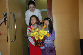 两个可爱的小朋友献花给米春梅阿姨表示祝福和感谢