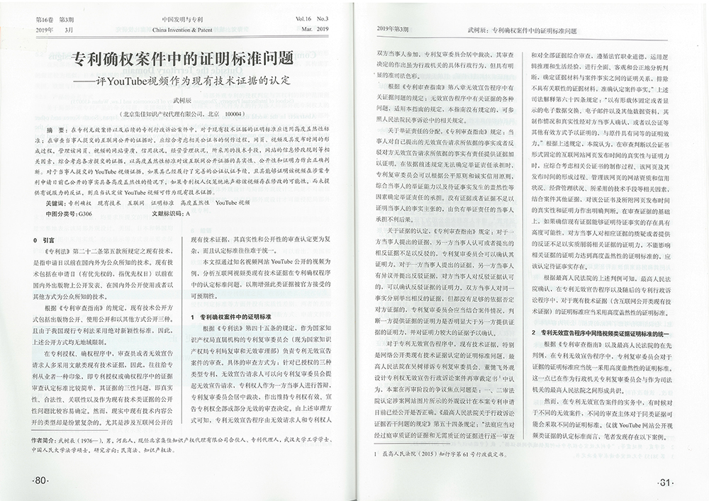 集佳文章《专利确权案件中的证明标准问题》在《发明与专利》发表