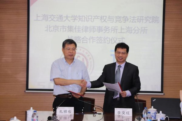 6月26日,北京市集佳律师事务所上海分所与上海交通大学知识产权与竞争法研究院战略合作协议签约仪式在上海交大徐汇校区凯原法学楼隆重举行。上海交通大学知识产权与竞争法研究院院长孔祥俊教授、刘维副教授,北京市集佳律师事务所上海分所主任李文红、资深顾问王俊河、合伙人李擘、合伙人张振军出席签约仪式。
