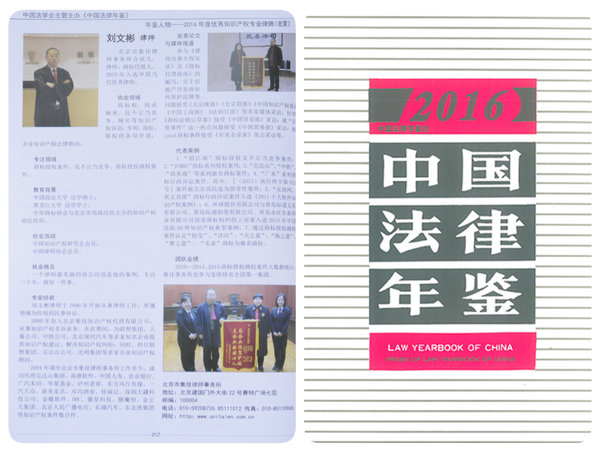 日前,由中国法学会主办的《2016中国法律年鉴》正式出版发行,集佳律师事务所合伙人刘文彬律师入选“年鉴人物——2016年度优秀知识产权专业律师”。