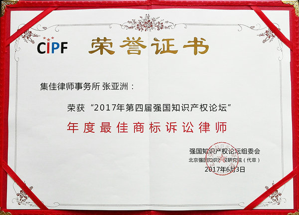 6月3日-4日,2017强国知识产权论坛在国家会议中心成功举办。会上,组委会发布年度知识产权领域优秀律师,集佳合伙人张亚洲律师被评选为“年度最佳商标诉讼律师”。