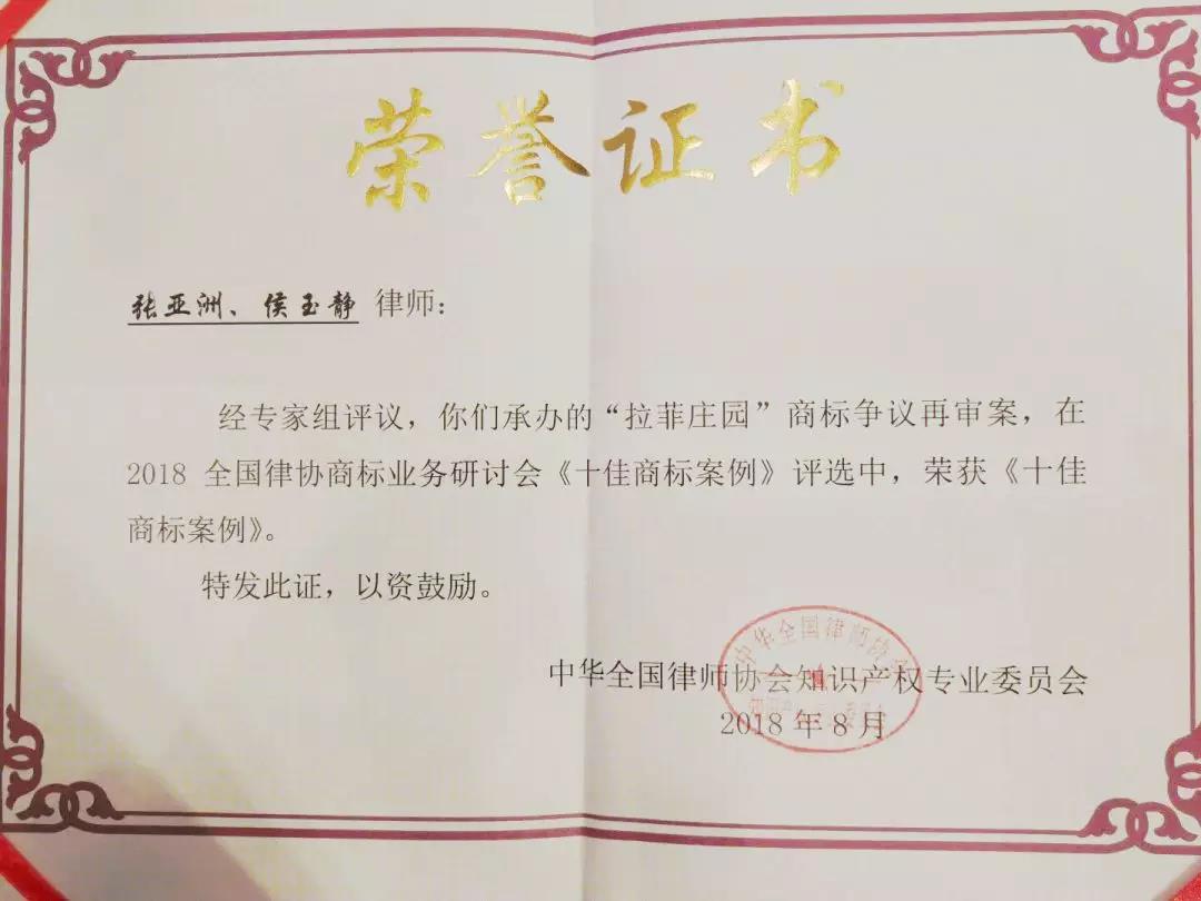 ▲ 集佳代理“拉菲庄园”案件入选“十佳商标案例”