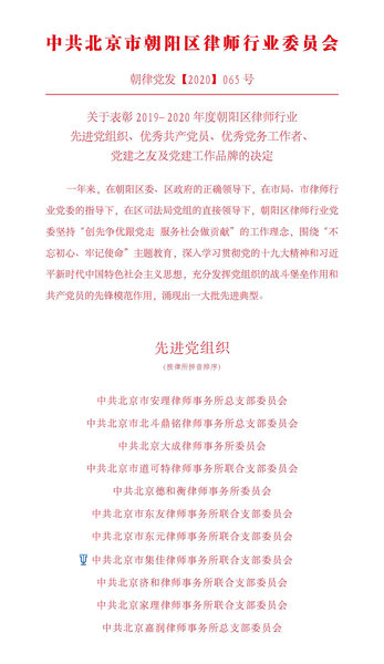 7月1日,在庆祝中国共产党成立99周年之际,中共北京市朝阳区律师行业委员会下发文件表彰2019-2020年度朝阳区律师行业先进党组织及个人,集佳律所党支部被授予“先进党组织”光荣称号。