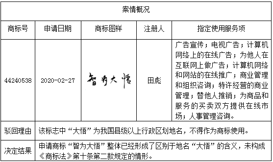 其次,“大悟县”虽然是隶属于湖北省孝感市辖区下的一个县级城市名称,但其作为县级城市名称并不被广大消费者所熟知,当普通消费者看到“大悟”二字时,想到是“大悟”二字本身的固有含义,而能够联想到“大悟县”的可能性不高,其不太可能被普通消费者误认是行政区划名称。