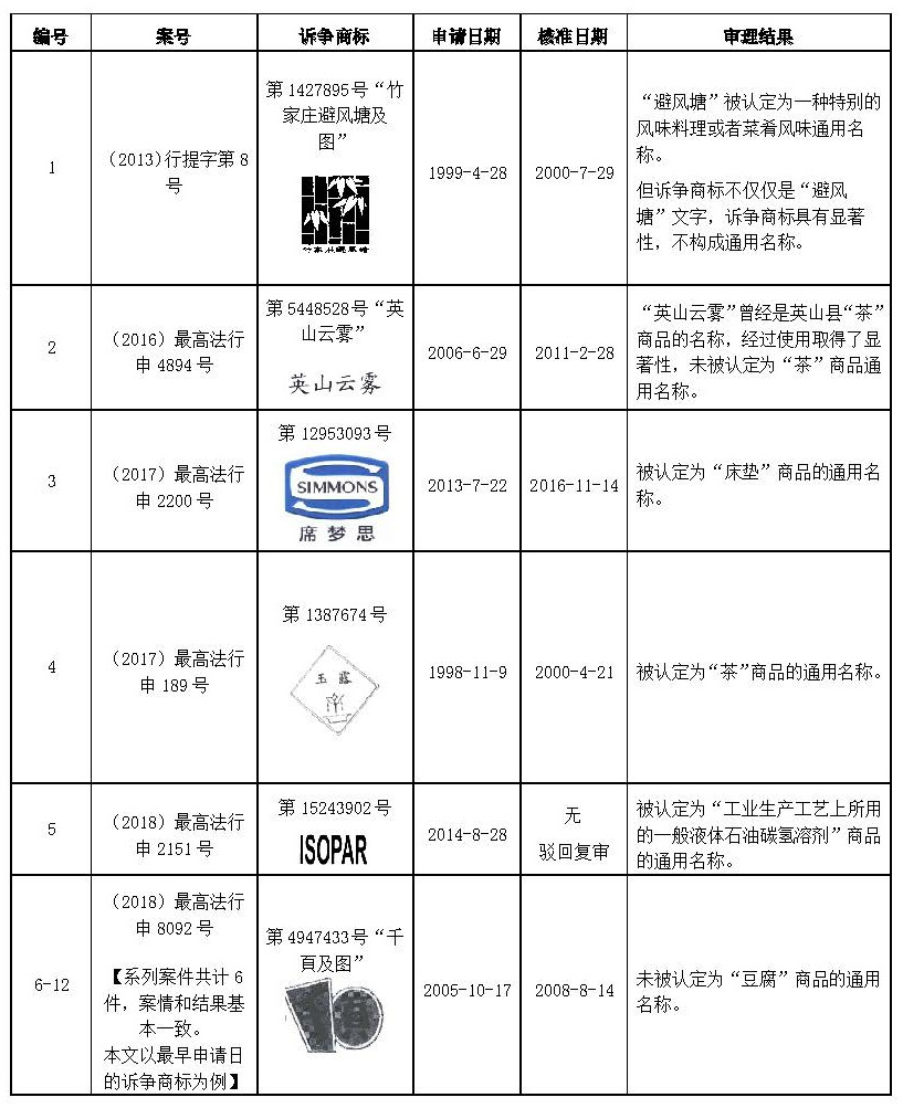 经查阅从2015年至今,中国裁判文书网收录最高人民法院涉及“通用名称”商标确权案件的行政裁判文书共计12份,包括11份行政裁定书和1份行政判决书,裁判作出的时间是2015年至2019年。笔者以这些文书为研究样本,分析商标确权中法院认定通用名称的考量因素和裁判标准。