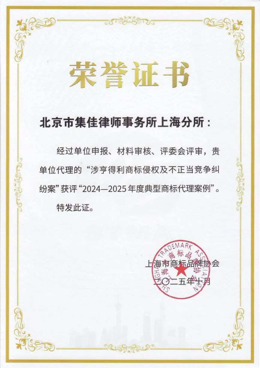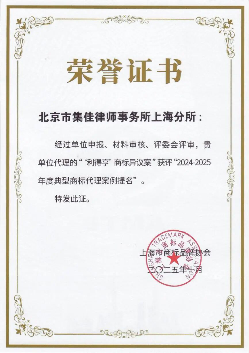 ★ 集佳上海分所办理的“‘利得亨’商标异议案”获评“2024-2025年度典型商标代理案例提名”