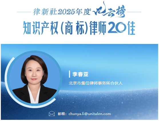 2025年10月22日,律新社重磅发布“律新社2025年度风云榜:知识产权(商标)律师20佳”榜单,集佳合伙人李春亚律师凭借在知识产权领域精湛的专业实力、杰出的业绩表现及良好的客户口碑,荣登20佳榜单!