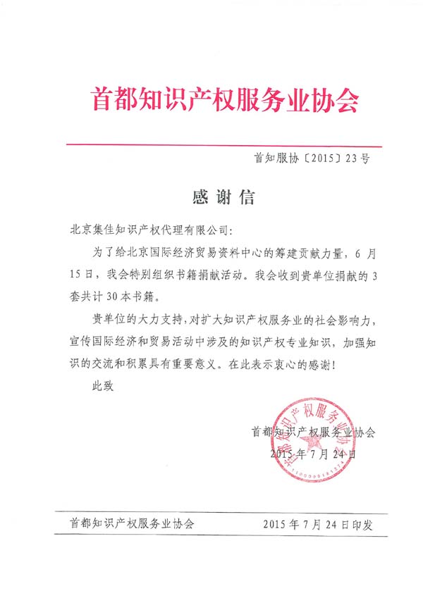 2015年7月24日,首都知识产权服务业协会向集佳发来感谢信。在其六月份组织的书籍捐献活动中,集佳捐赠30本出自集佳专业人士的系列丛书《知识产权战略与实务》,为北京国际经济贸易 ...